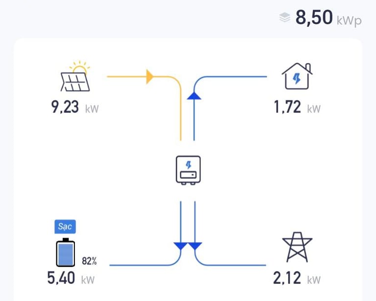 Các hệ thống chúng tôi thiết kế đều đạt hiệu suất rất cao nhờ tối ưu hóa từng yếu tố như hướng tấm pin, góc nghiêng, chia string và mppt hợp lý... Kết quả là hệ 8.5kwp cũng có thể cho hiệu suất vượt đỉnh lên tới 9,23kw khi nắng tốt (như trên hình)