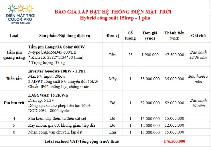Bảng giá hệ 15kwp 1 pha siêu bảo hành