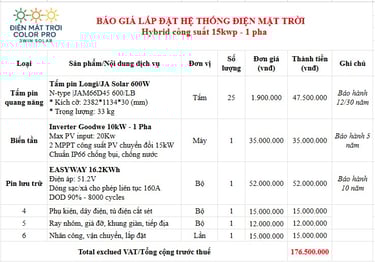 Bảng giá hệ 15kwp - 1 pha - lưu trữ 16kwh cao cấp