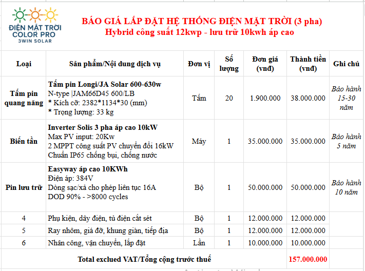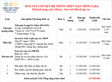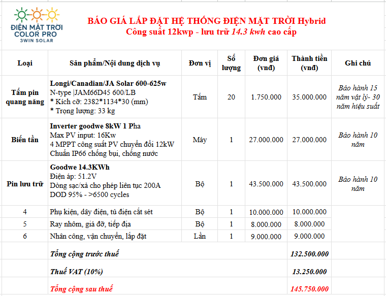 Bảng giá hệ thống điện mặt trời 12kWp Hybrid