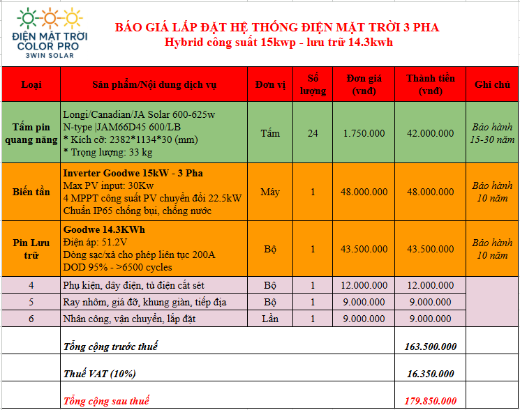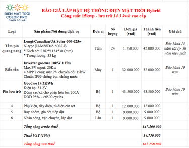 💰 Bảng giá hệ thống điện mặt trời 15kWp (Full GoodWe cao cấp)
