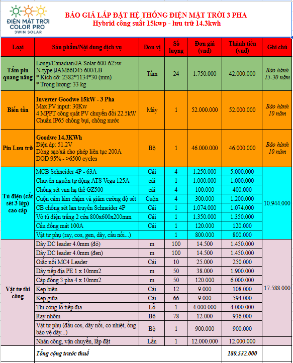 Bảng giá lắp đặt điện mặt trời trọn gói 15kWp (3 pha) - lưu trữ 14.3Kwh sử dụng đồng bộ combo biến tần và pin lưu trữ Goodwe - thương hiệu top 3 thế giới. Tổng trọn gói: 198.162.000đ