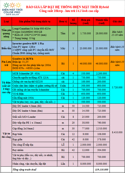Giá Lắp Điện Năng Lượng Mặt Trời 10kWp Hybrid Lưu Trữ 14.3kWh & Báo Giá Chi Tiết Từng Hạng Mục