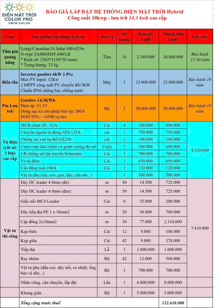 6. Bảng giá lắp đặt điện mặt trời trọn gói 10kWp Hybrid GoodWe
