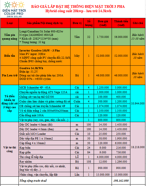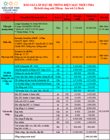 Chi tiết bảng giá hệ thống 20kWp Hybrid GoodWe (bao gồm toàn bộ vật tư, thi công, cấu hình và bảo hành) đã được thể hiện rõ trong hình ảnh đính kèm.
