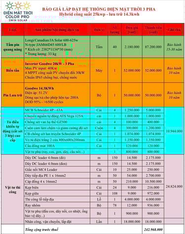 Chi tiết bảng giá hệ thống 25kWp Hybrid GoodWe (bao gồm toàn bộ vật tư, thi công, cấu hình và bảo hành) đã được thể hiện rõ trong hình ảnh đính kèm.