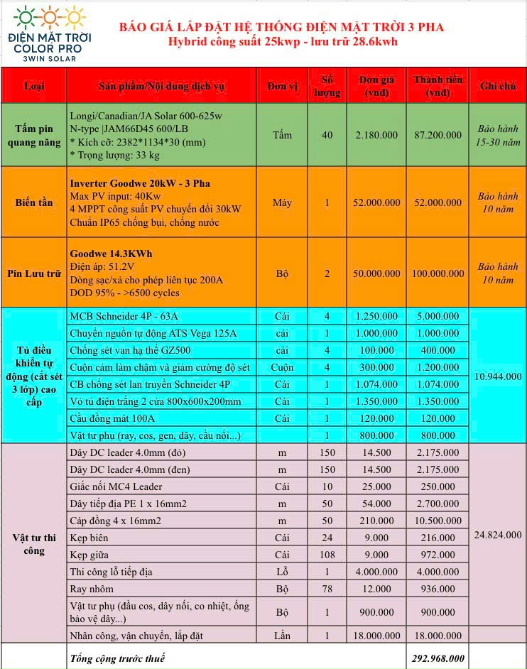 Bảng giá lắp đặt điện mặt trời trọn gói 25kWp (3 pha) - lưu trữ 28.6Kwh