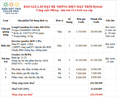 Chi tiết bảng giá hệ thống điện mặt trời trọn gói 10kWp Hybrid sử dụng thiết bị GoodWe được tôi thể hiện trong hình ảnh minh họa bên dưới bài viết.