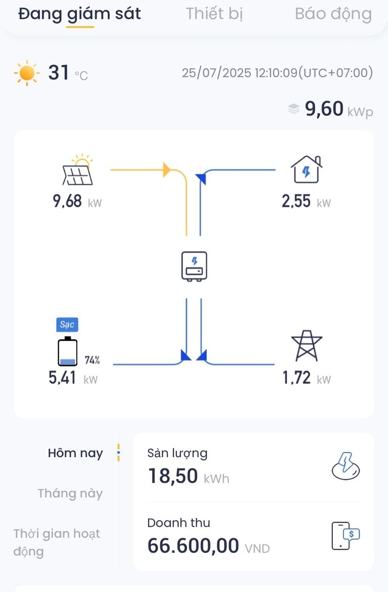 Với nhiều người, chỉ cần đạt được 70-80% công suất danh định khi nắng tốt đã là thành công. Nhưng với chúng tôi, các hệ thống điện mặt trời còn làm được nhiều hơn thế, thậm chí còn vượt 102 - 110% công suất đỉnh của hệ thống. Như ở hình trên, hệ thống 9.6Kwp có thể tạo ra công suất 9.68kW, hệ 8.5kWp có thể tạo ra 9.23kW.