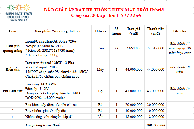 Chi tiết bảng giá hệ thống 20kWp Hybrid GoodWe (bao gồm toàn bộ vật tư, thi công, cấu hình và bảo hành) đã được thể hiện rõ trong hình ảnh đính kèm.